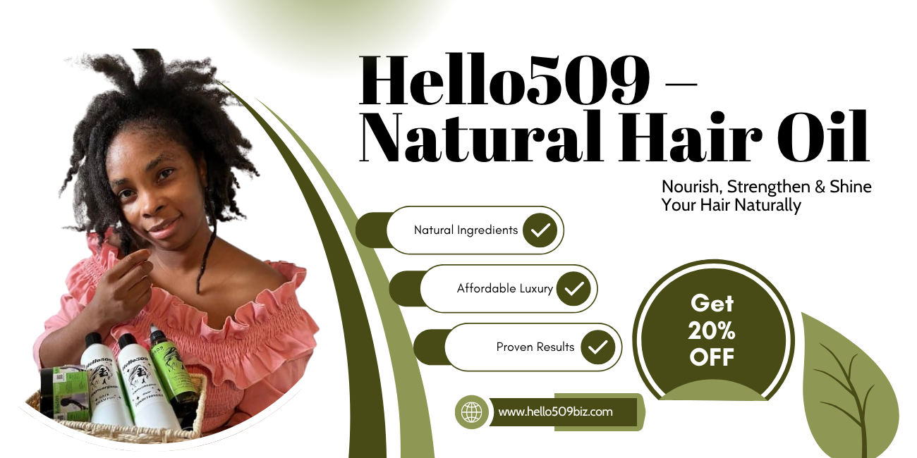 Enjoy up to 30% off on Hello509 Hair Oil — 100% natural, nourishing, and made to bring your hair back to life. Don’t miss out, your glow starts today!